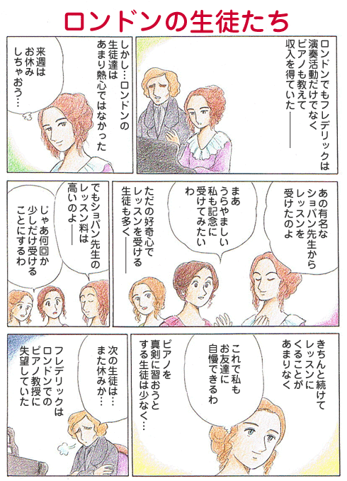 それでもその収入は、ショパンのロンドンでの生活を大いに助けたのだった。が、ロンドンは物価が高く、ショパンの場合、家賃や馬車代など、出費も多かったので、経済的に不安を感じていたようである。