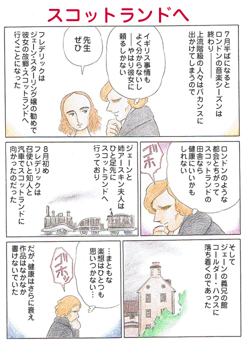 1848年8月5日、ロンドンのユーストン駅から午前9時発のエディンバラ行き急行の一等車に乗った、とショパンの手帳に書いてあるという。ロンドンからエディンバラまで670キロあるが、12時間で到着した。エディンバラに着くと、その日は高級ホテルに一泊し、8月7日にジェーン・スターリングの義兄の館コールダー・ハウスへ馬車で向かった。
