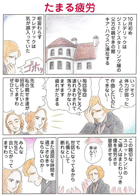 ショパンは体の不調を訴え、「作曲したいができないのです。いろんな方に招かれ、仕方なく毎週飛び回ってます」「2時間は食卓で、恐ろしいほど退屈した時間を過ごします」「スコットランド人姉妹(ジェーン・スターリングと姉のアースキン夫人)は、親戚の家へ私を連れ回し、休むことをさせず、疲れさせます」「彼女たちは親切でやっているのでしょうが、その親切は僕を窒息させるのです」とこぼしている。