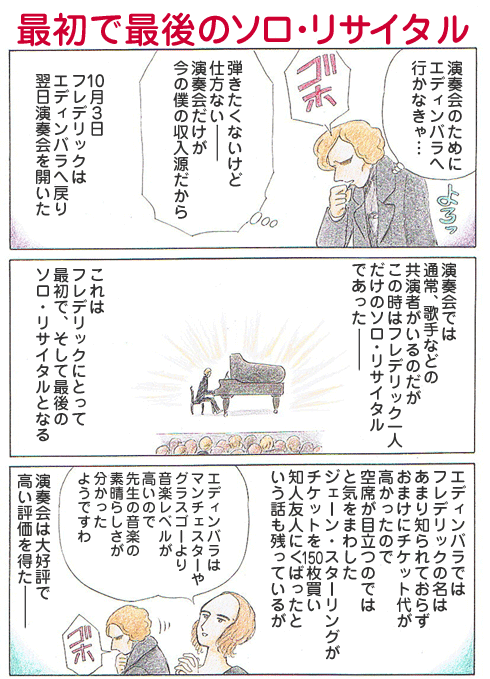 この時期、弟子のロジエール嬢に「エディンバラで演奏します。でもそれは仕事として仕方なく行うのです。音楽好きな人たちが、私に演奏するようにと、私を苦しめるのですが、儀礼として演奏するのです」というようなことをこぼしている。