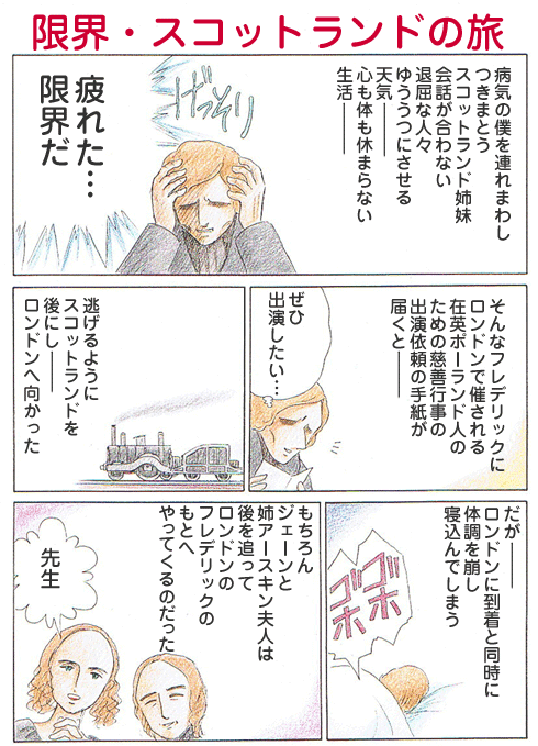 友人のロード・ダドリー・スティアートから11月16日に行われるポーランド人のための慈善音楽会で演奏してほしいとの手紙を受け取ると、ロンドンへ向かい、10月31日に到着するが、旅の疲れで、いっそう衰弱し、寝込んでしまう。お見舞いにはジェーン・スターリング、アースキン夫人のほか、チャルトリスキ公夫妻などがよく訪れたという。