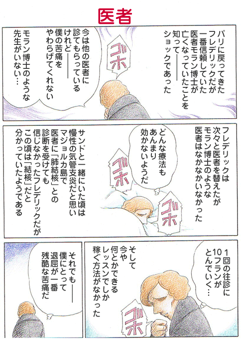 1843年頃から掛かっていて非常に信頼をしていたモラン博士はショパンがイギリスに行っている間に亡くなってしまった。それからはショパンは何人も医者を替えたが、ショパンの苦痛をやわらげてくれる医者はなかなかいなかったらしい。