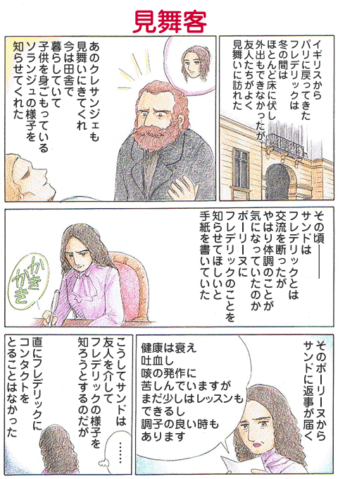 ショパンに世話になったクレサンジェは恩義を感じてか、お見舞いに訪れたり、子供を身ごもり身動きできないソランジュとは手紙のやりとりを続けていたりして、この夫婦とショパンとのつきあいは続いていた。