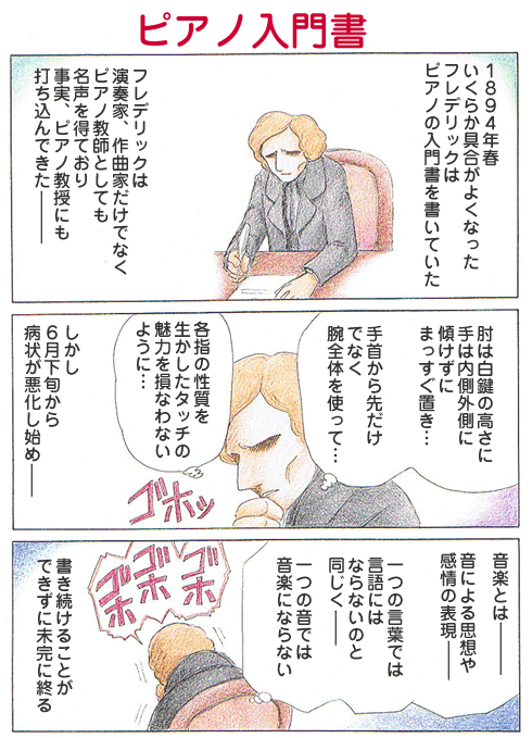 OCT 9, 2009 第150回 ピアノ入門書 連載 1.ピアノ入門書 未完になったが、草稿が遺されている。 林 倫恵子(はやしりえこ) 漫画家・ピアノ指導。ホームページ ショパン物語(林 倫恵子)TOP 連載一覧に戻る 第149回 ドラクロワと語る 第151回 引越し 現行サイトで見る → こちらも読んでみませんか 調性が曖昧な序奏から聖歌「神はわが力」へと導かれる 山田 耕筰「前奏曲《聖福》」 2010年に作曲 伊左治 直「ビリバとバンレイシ」 中学時代から独学で作曲を学んだ横浜の少年 黛 敏郎