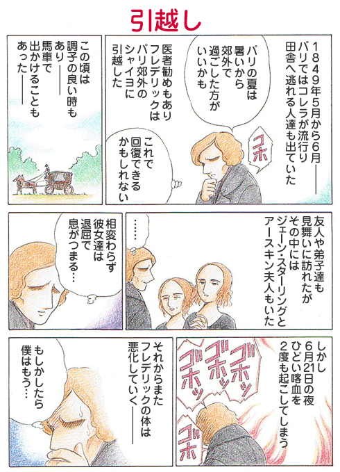 1849年春は、いくらか具合の良い日もあり、ショパンは外出もしていた。引越しの時期は5月または6月だったと言われている。