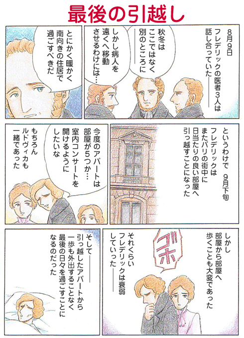 シャイヨの家賃は高く、またパリへ戻ることにしたショパンだが、以前いたオルレアン広場のアパートではなく、ヴァンドーム広場12番地にある新しいアパートを借りることにし、9月下旬に引っ越した。引っ越した当初はまだ元気があり、家具を注文したり、室内コンサートが開けるように計画を立てたりしていたという。が、病状は悪くなり、引越ししてからは、アパートから一歩も外に出ることはなかった。