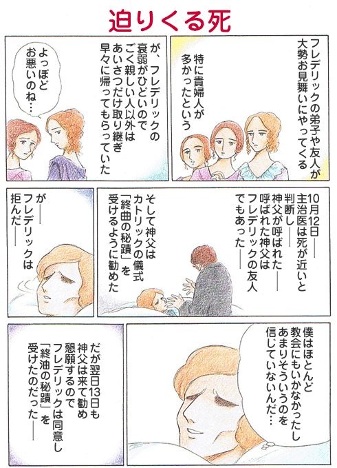 カトリックの信仰心があまりなかったショパンは最初は「終油の秘蹟」を受けるのを拒んだが、神父があまりにも懇願するので、受けたという。