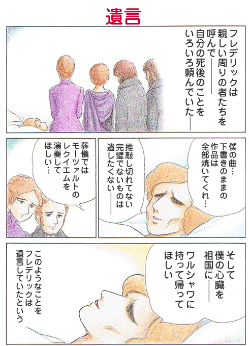 ショパンは苦痛が和らいだ時に、感謝と別れの言葉を口にし、遺言した。(10月16日に遺言がされたという説もある。)