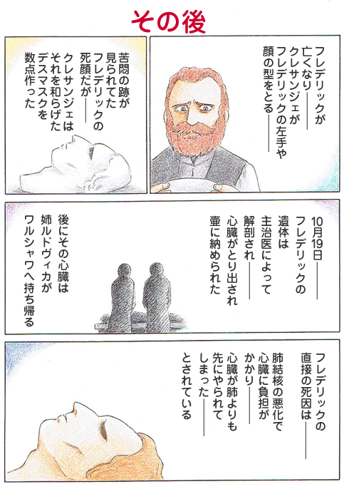 1.デスマスク 現在、よく見るショパンのデスマスクは、苦悶の跡を取り去り、比較的安らかな表情をしているが、実際はかなり苦痛に歪んだ表情をしていたようである。