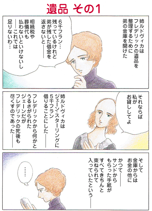 後に、ルドヴィカがワルシャワに帰る途中、国境でロシアの税官吏に検閲されるのを恐れて、旅館を営む知人に預けたが、後に、知人の伝で、サンドがこのことを知り、手紙を返してもらい、手紙はサンドのもとへ戻ってしまったという。サンドはそれらをすべて焼却してしまったと言われる。