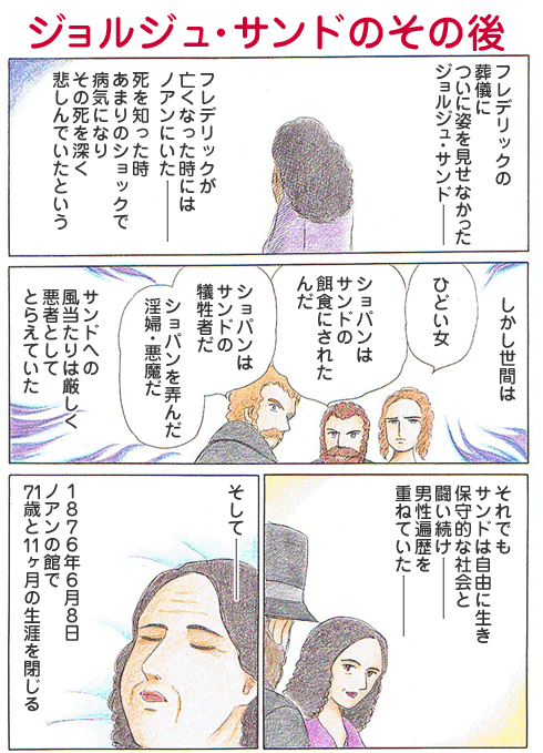 SEP 22, 2010 第173回 ジョルジュ・サンドのその後 連載 1.サンドの記録 ショパンが亡くなった後、11月9日に編集者宛てに「ショックで私は健康をなくし、深く悲しんでいます」と書いている。 林 倫恵子(はやしりえこ) 漫画家・ピアノ指導。ホームページ ショパン物語(林 倫恵子)TOP 連載一覧に戻る 第172回 ショパンを愛した人達のその後 第174回 ドラクロワの画 現行サイトで見る → こちらも読んでみませんか 実は没後に出版されたのに、ソナタ中で最も演奏機会が多い人気作 メンデルスゾーン「ピアノ・ソナタ 第3番 変ロ長調 Op.106 MWV U 64」 実は、gravitaという珍しい指示語が雰囲気を決定 カバレフスキー「24の前奏曲 ラルガメンテ・コン・グラヴィタ Op.38-18」 カンディンスキーに影響を与えた画家でもある作曲家 チュルリョーニス