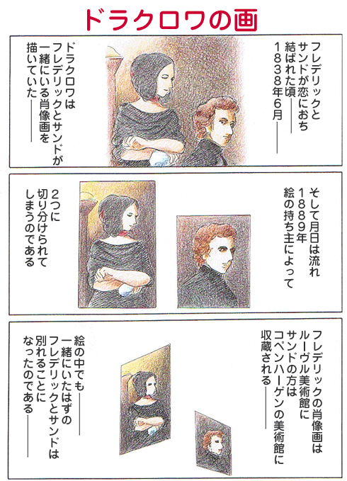 ドラクロワの死後、友人の手に渡り、この後、絵が競売にかけられたという。そのときに、2つに分割されてしまったのか、ショパンの肖像画はルーブル美術館に、サンドの方はコペンハーゲンのオードロップゴー美術館に所蔵されている。