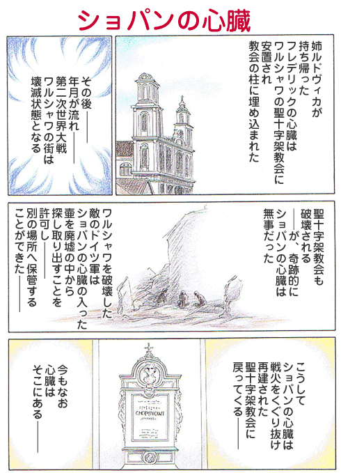 NOV 12, 2010 第176回 ショパンの心臓 連載 1.ショパンの心臓 聖十字架教会の廃墟から、ショパンの心臓が入った壺は無事に取り出され、ワルシャワ市から南西にある街ミラヌーヴェックに疎開させる。そして、戦争が終わり、1945年10月17日のショパンの命日に、心臓はワルシャワに戻ってくる 林 倫恵子(はやしりえこ) 漫画家・ピアノ指導。ホームページ ショパン物語(林 倫恵子)TOP 連載一覧に戻る 第175回 献呈されなかったサンド 第177回 ショパンコンクール その1 現行サイトで見る → こちらも読んでみませんか ポルトガル王への献呈曲集で最も有名なニ短調のアレグロ・ソナタ スカルラッティ, ドメニコ「ソナタ ニ短調 K.9 L.413」 実は冒頭の伴奏が主拍を欠いている モーツァルト「メヌエット ハ長調 KV.6」 チャイコフスキーに師事、ピアノ協奏曲を世界初演 タネーエフ, セルゲイ