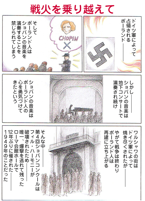 DEC 24, 2010 第179回 戦火を乗り越えて 連載 1.第4回ショパンコンクール 戦争の後の所為で、第3回より大幅に応募者が減り(250名から63名に)、最終的に54名の出場者で行われた。しかし、審査は3段階方式、本選の課題曲は、今まで協奏曲ホ短調またはヘ短調の第2楽章のみだったのが、全楽章演奏となり、厳しくなっている。 林 倫恵子(はやしりえこ) 漫画家・ピアノ指導。ホームページ ショパン物語(林 倫恵子)TOP 連載一覧に戻る 第178回 ショパンコンクール その2 第180回 そして現在へ 現行サイトで見る → こちらも読んでみませんか デビューコンサートで披露し作曲家の名声を確立 グラナドス「スペイン舞曲集 Op.37」 シンコペーションの前奏曲とスタッカートのフーガが鮮やかに対比 ショスタコーヴィチ「24のプレリュードとフーガ 第2番 Op.87-2 イ短調」 インディオの血を継ぐ孤児、独学で作曲家になった男 チャベス