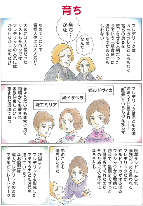 FEB 18, 2011 番外編02 育ち 連載 ショパンの姉妹姉ルドヴィカは1807年生まれ、妹イザベラは1811年生まれ、末妹エミリアは1812年生まれ。しかし、エミリアは14歳で、結核で亡くなる。 林 倫恵子(はやしりえこ) 漫画家・ピアノ指導。ホームページ ショパン物語(林 倫恵子)TOP 連載一覧に戻る 番外編01 フレデリックの「格好」 番外編03 子どもの頃 現行サイトで見る → こちらも読んでみませんか ドリア調の響きがグレゴリオ聖歌を思わせる カバレフスキー「24の子供のためのやさしい小品 メロディー Op.39-8」 現在では偽作とされる バッハ「アルマンド ハ短調 BWV 834」 作曲家からレコード会社ディレクターへ転身した男 ホローシュ