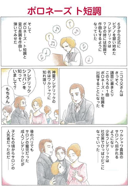 1818年、ワルシャワ有数の雑誌で、7歳の神童がポロネーズを作曲したということで、フレデリック・ショパン初めての記事が載った。そして、1818年2月24日にラジーヴィウ宮殿で初めての公開演奏を行い、「モーツアルトに代わる期待の星」として、サロンの人気者になる。