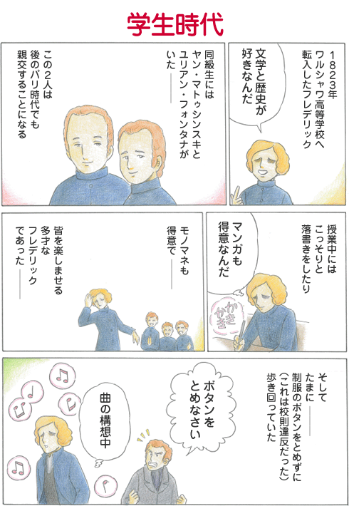 MAY 20, 2011 番外編08 学生時代 連載 1.逸話 ・・・フレデリックは、ワルシャワ高等中学校最終学年の時に、ミサのオルガニストを務めていたが、そこでフレデリックは自分の世界に入り込んでしまい、延々と即興演奏を続けるので、やめさせられたという。 林 倫恵子(はやしりえこ) 漫画家・ピアノ指導。ホームページ ショパン物語(林 倫恵子)TOP 連載一覧に戻る 番外編07 ニコラ父さんの教育方針 番外編09 演劇好き 現行サイトで見る → こちらも読んでみませんか 上下声部で主題が交替する表現のバランスが鍵 バッハ「5つの小プレリュード BWV 939-943」 決定的な主和音解決なしに主題確保へ入る独自の設計 ブラームス「ピアノ三重奏曲 第1番 第4楽章 Op.8」 軍楽隊でホルン奏者、のちに国家援助作曲家に ニールセン