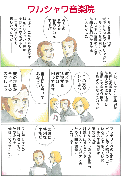 ワルシャワ音楽院エルスネル院長は、文部大臣に学生達の勉学の状況を報告しなければならなかったが、この報告書のフレデリック・ショパンの欄には「格別の才能・音楽的天才」との書き込みがされていたという。