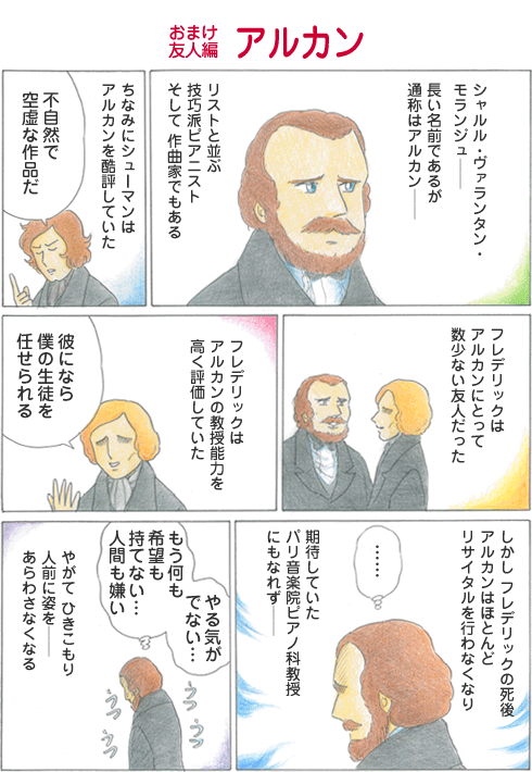 アルカンは6歳でパリ音楽院に入学、10歳ですでにピアノ科を一等賞で修了、サロンの寵児となり、リスト、そしてショパンと親交を持つようになる。シューマンからは作品を酷評されたが、リストは高く評価していた。リストは、パリに滞在したときには、必ずアルカンのもとを訪ね、その友情は生涯続いたという。