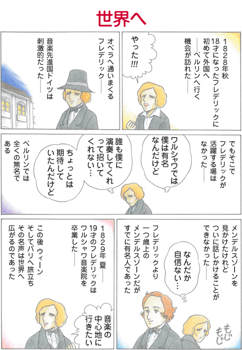 2.世界へ父二コラは、フレデリックをワルシャワの外、世界的音楽都市へ行かせる為に、文部大臣に奨学金の申請書を出した。しかし、これは却下されてしまい、後に、私費でウイーン旅行に行かせる。ベルリン、そしてウイーンでの音楽経験で、フレデリックはますます音楽の中心地への留学・音楽活動を熱望したのだった。