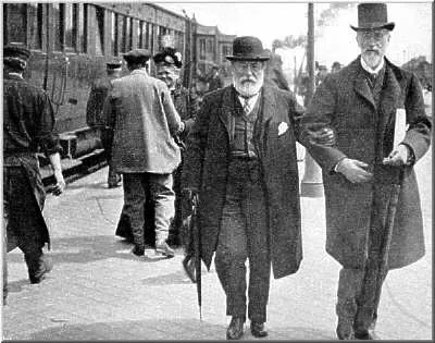 後年、芸術アカデミー院長となり、ローマ賞を選考する立場となったサン=サーンスが、1909年、受験会場の視察のために駅に降り立つ様子(手を引くのはテオドール・デュボワ)