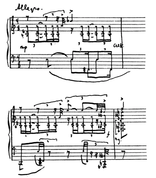 「スクリャービンのソナタ10作品」は、「作曲家の生前に、幸いにも彼自身から聴くことのできた貴重な指示を軸にして」(Ibid.: 3)書かれたもので、すべてのソナタについて手書きの譜例付きで詳細に分析を行っています。例えば、第7番の譜例は以下のとおりです(Ibid.: 41)。