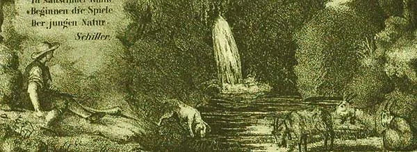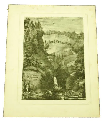 「巡礼の年」は何度かにわけて出版されましたが、最終的に1855年、新たに全曲版が出されました。現在では多少退色しているものの、リト摺りの当時としては手の込んだ豪華なものです。スイスの谷あいの泉には家畜、羊飼い、牧羊犬、良く見てみると丘の中腹には旅人が描かれています。