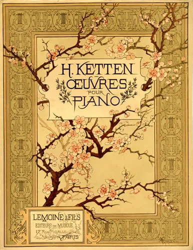 最後は梅の花をあしらった春らしい表紙のピアノ曲です。これは1886年の楽譜です。当時日本風のものがヨーロッパで流行したいわゆるジャポニズムの影響によるものです。表紙を開けると次のページも花をあしらったもので、作曲者・ケッテン(Henry KETTE) のパラフレーズのカタログになっています。この手の楽譜はヨーロッパでは中身よりもそのデザインによってコレクターがたくさんいて中々入手困難なものの一つです。個人的にはお気に入りの一つです。右下にデザイナーのサイン GIRADON も読み取れます。