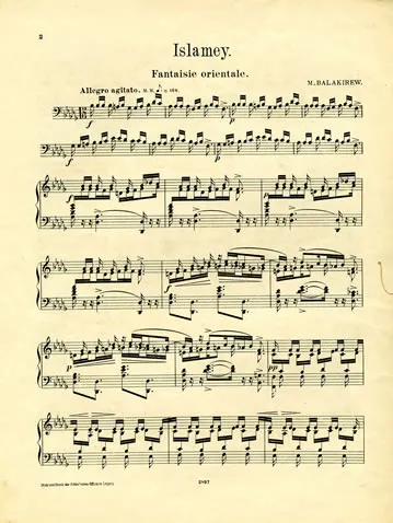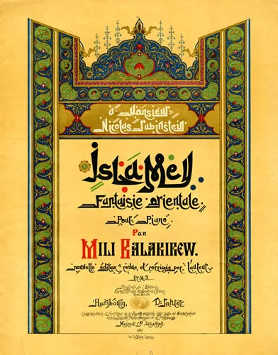 2曲目はバラキーレフ(Mili BALAKIREW 1836-1910) 作曲の『イスラメイ=東洋的幻想曲』です。この版は1890年代後半の第2版です。かつて似たようなデザインの同じ曲を所有していましたが、そちらも金をあしらったアラブ風の文字配列のものでした。わざわざ別の表紙を作るほど人気があったのでしょう。まるでモスクのモザイクを連想させるようなこの表紙を見ていると、こちらは曲のイメージとぴったり来ますね。名ピアニストのチェルカススキーの名演が今でも耳に残っています、素晴らしい曲です。バラキーレフといえば、マズルカをともなった素晴らしいピアノ・ソナタがありますが、日本でもどんどん演奏してもらいたいですね。