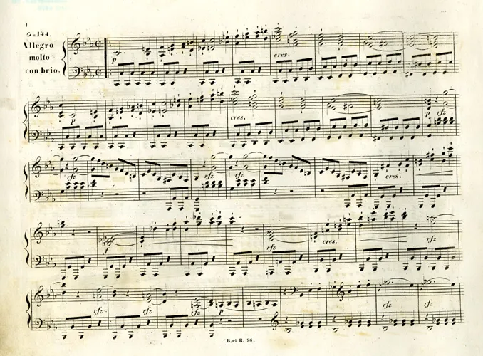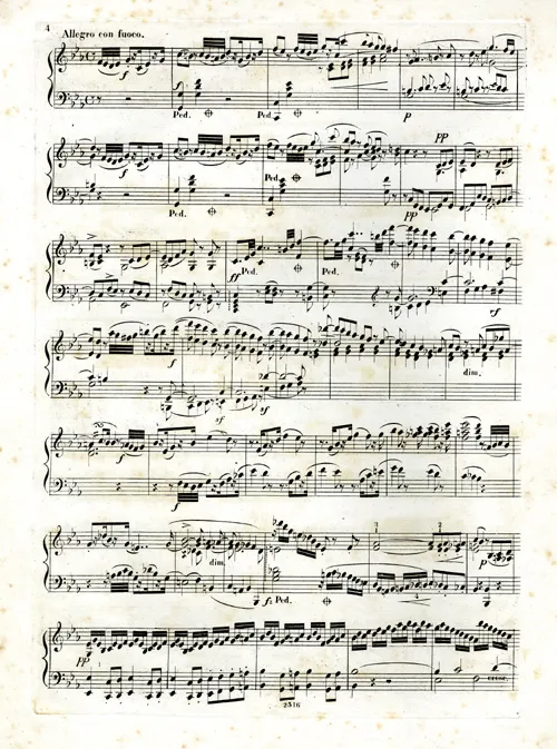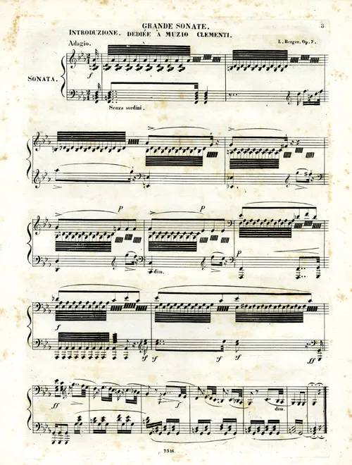 作曲家としては歌曲が中心で、当時はミューラーの詩に作曲した"美しき水車小屋の娘"がもてはやされました。同じ詞をもとにシューベルトも1822に有名な歌曲を作っていますね。さて彼のピアノ・ソナタですが、"グランド・ソナタ・パテティーク"作品1として1804年にペータースから初版が出てお師匠であるクレメンティに献呈されました。今回紹介するのは1840年にライプチィッヒのホフマイスターから出された改訂版で、作品7となっています。但し表紙ページを見ればおわかりのように" Pathétique = パテティーク"の文字は見当たりません。これは日本語にすると『悲壮な(悲愴な)』、つまり人を感情的に動かすというフランス語の形容詞ですが、ギリシャ語が語源でベートーヴェンも1899年に出版された作品13のタイトルに用いています。このソナタは若きベルガーがベートーヴェンに影響されて書き上げたことは明らかです。当時はベートーヴェンの悲愴があまりに斬新で人気を博したことから、アカデミズムにどっぷり浸かっていた音楽院などからはけしからんソナタの刻印をおされ、生徒達に演奏禁止令が出たほどです。最初のページを見てください、アダージョの壮大な序奏が1ページ展開されています。2ページ目はアレグロ・コン・フォコで曲は進んでゆきます。