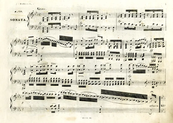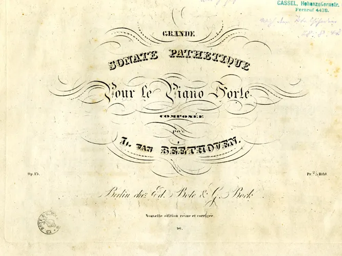 さてそろそろ今回の2曲目の楽譜に話をうつしましょう。こちらは本家本元の『悲愴』です。これは初版ではなく1820年頃のものでボッテ・ボックから出版されました。初版はウィーンのエーダーから1799年に出版され、リフノフスキー公爵に献呈されています。この版は現代の我々には横長で不思議な感じですが、当時はまだこのような、まるでチェンバロの楽譜のようなものはよくありました。私事ですが以前からベートーヴェンが具体的にどの曲にヒントを得てこの『悲愴』を創るに至ったか興味がありました。