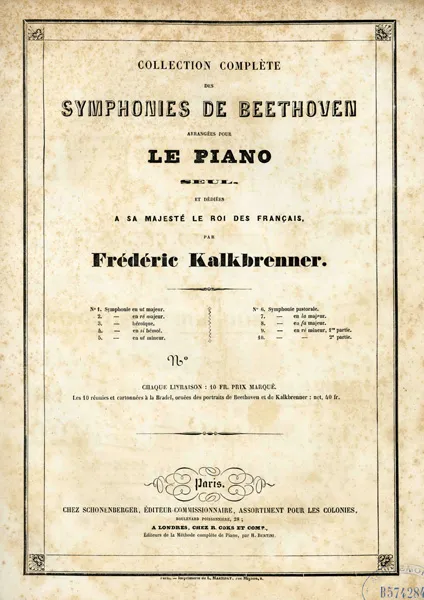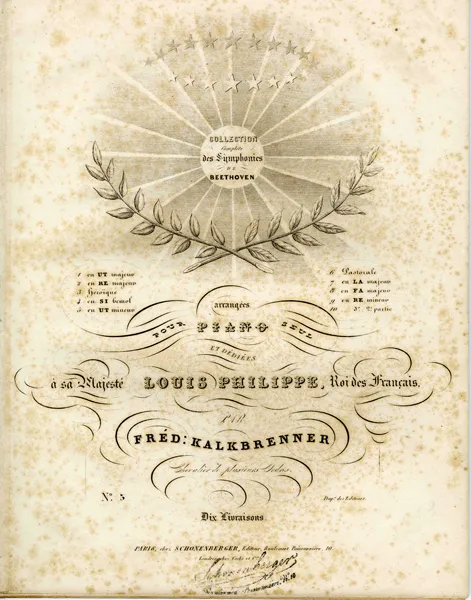 話は長くなりましたが、個人的なことを申し上げれば、フランス留学中に触れることが出来た歴史に対するこれらの認識、感覚に基づいて、音楽のことも考えざるを得ません。今回は敢えてカルクブレンナーのピアノ・ソロ編曲を紹介します。先に挙げたリストのベートーヴェンのシンフォニーのピアノ・ソロ編曲に先立って出版されたのがこのカルクブレンナーのソロ版です。具体的にはこの版は1838年頃にパリで出版された初版で、ドイツでは1837年に初版が出ています。全体は10分冊で構成されています。ベートーヴェンのシンフォニーは9曲ですが、第9番が2冊構成になっている訳です。表紙を見ると当時の楽譜にはありがちな献呈者の名前が中心になった構成で、ここでは『ルイ・フィルップ王』です。作曲者名もフランス風に Fréd(éric) となっています。因みにリストは自らのソロ・編曲を出版社に印象付けるために『今までに何冊もの凡庸なソロ・編曲が出されたが、これこそが決定版である』という趣旨のことを書き送ったそうです。