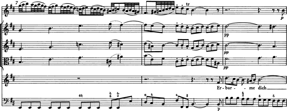 主題の形に注目してみましょう。16分音符でd音を半音下に刺繍してd-cis-dと修飾したのち、突然完全4度下行(d-a)、その後短6度上行(a-f)します。短6度の上行を、何人かの18世紀の理論家たちはとくに「驚き」の情念と結びつけて「エクスクラマツィオ」と呼びました(英語の「エクスクラメーション」ですね)。「驚き」を引き起こす情念には、称賛や喜び、憤り、苦しみなどさまざまなものがあります。 J. S. バッハの《マタイ受難曲》のアリアから、〈神よ、憐れんでください〉(ロ短調)を挙げてみましょう。これは、キリストの弟子ペテロが、キリストの仲間であることを追及されて、仲間ではないと3回否認してしまったことを泣きながら後悔する場面です。啜り泣くように装飾されたヴァイオリン 独奏の後に、歌がfis-dの短6度上行で「憐れんで下さい」と歌い始めます。悲しみとともに懇願する強い情念が、この音形に託されています。
