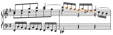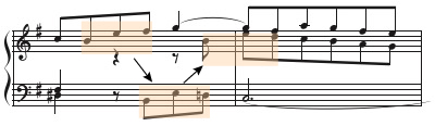 第2部は、第1部といくつかの点で対照的です。まず、主題が中声部で提示され(第14~15小節)、続いて上声部(第16~17小節)へと移ります。そして、下声での主題提示はありません。第1部の上から下へ、という順序と逆になっており、その後、ニ長調に転じることもあり、悲しみの中に光が指す部分です。第1部と対象をなすもう一つの要素は、16分音符による下声部の新しい対位句です。よく見ると、第1部の対位句と同じ音程で作られるモチーフが二倍の音価になって展開されていることが分かります(第14小節のfis-h-a)。細かい音符で動き続けるリズムは、「生」の象徴でもあります。第20~23小節で、この生き生きとした対位句はゼクエンツを形づくりながらすべての声部に響き渡り、ニ長調へと推移します。