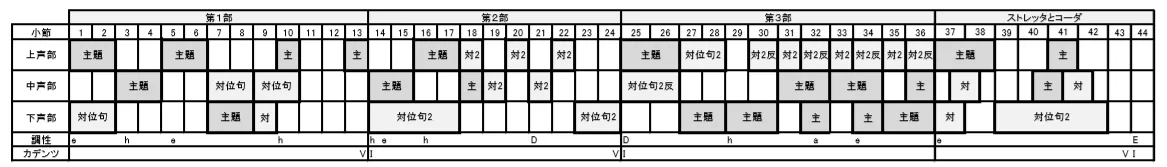 第2部:第14~24小節 第3部:第25~36小節 第4部(ストレッタとコーダ):第37~44小節