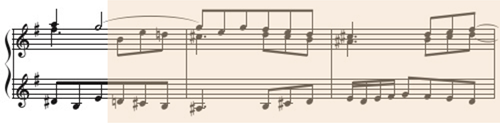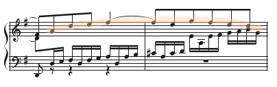 では、主題の性格を見てみましょう。上声部の主題は冒頭、hからまで6度上行します。短六度上行するのはエクスクラマツィオでした(⇒第4番)。ここではその間にe-fisが挟まりますが、それでも訴えかけるような表出力の強い出だしです。主題の最高音はaで、短7度まで広がっています。第3小節でcisが現れることによってドミナントが強く感じられ、主題の区切りが示され中声部に主題が移ります。主題は、上声→中声→下声の順で出てくるので、天から地上に主題が下りてくるようです。この主題には第1~2小節の左手のh-e-d-cという対位句が付随しています。主題のアウトラインと同じくアーチ形を基本にしています。これらがこの楽曲の展開の基本素材です。