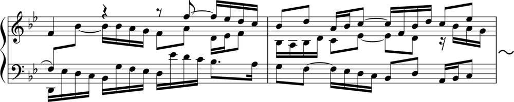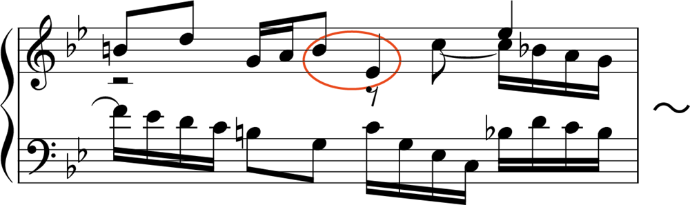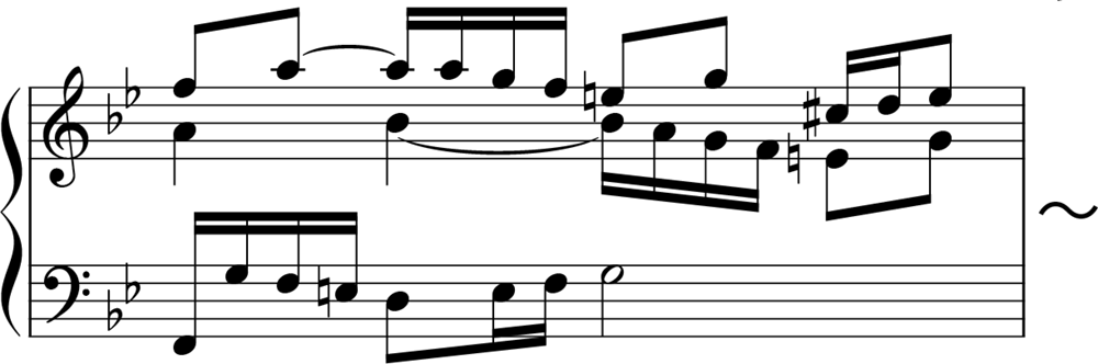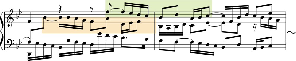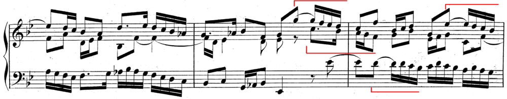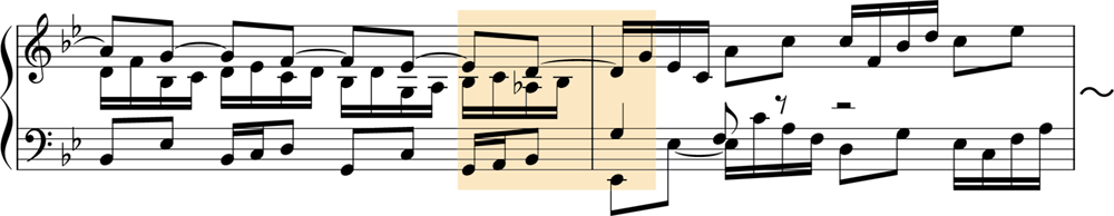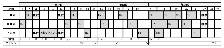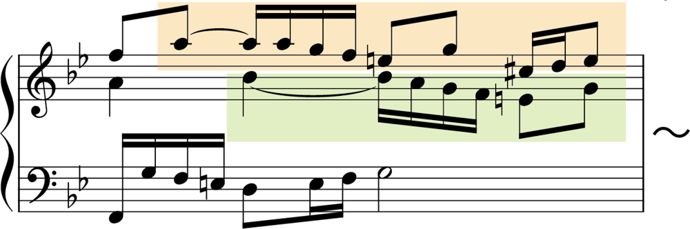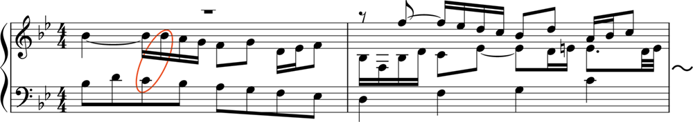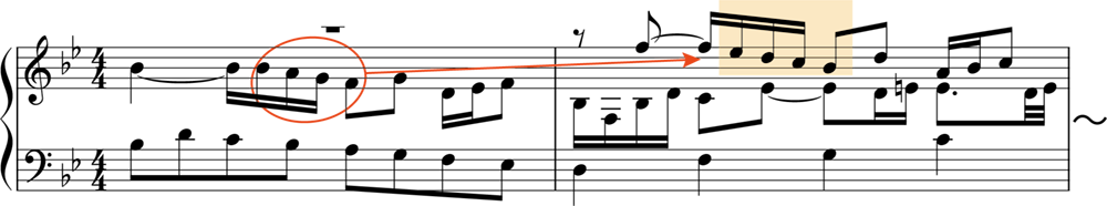 この曲で重要なのは、「ストレッタ」です。図の第1部では、主題(Th.)が、全体が示されてから応答されています。しかし、第2部・第3部では少し様相が異なり、主題同士が重なり合っているところがあります。このように、主題が完結しないうちに他の声部に主題が畳み掛けるように現れる部分のことをストレッタと呼びます。第12・13小節および第17・18小節、第20・21にストレッタが見られ、とくに第17小節では、中声部が上声部に半拍遅れで入る近接したストレッタを形づくっています(譜例の2小節目)。