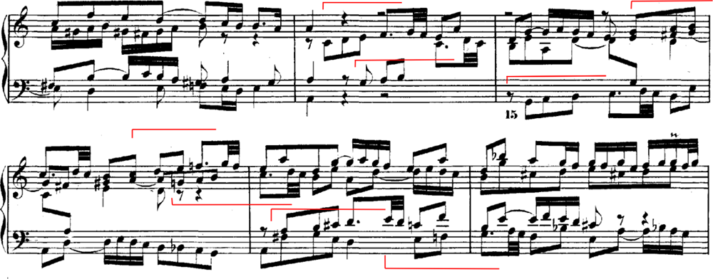これまで見てきた《シンフォニア》の楽曲では、フーガ風の模倣で始まる曲が多くありました。この曲も、中声部に始まる主題が上声部で応答されることによって始まります。しかし、これまでのフーガ風の曲とは異なり、第14番では主題とそのモチーフがいたるところに現れます。
