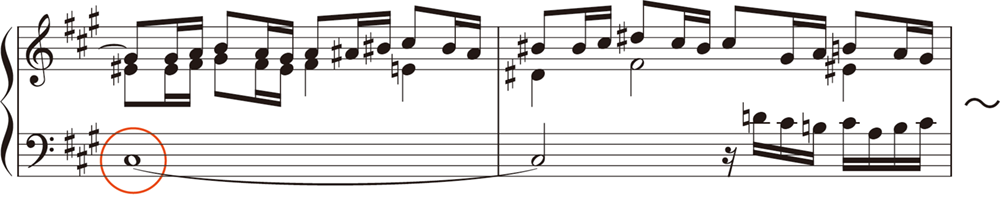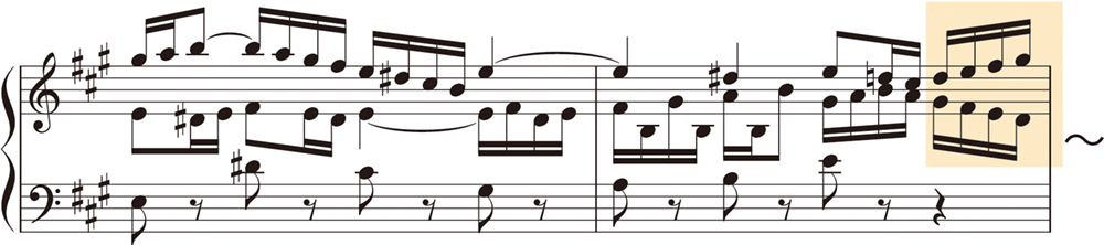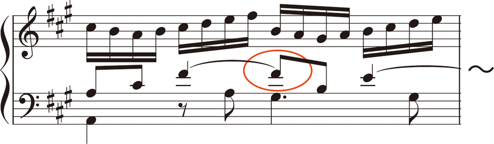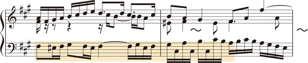 この主題のもう一つの特徴は、第2小節の右手1・2拍目を構成するジグザグ音形です。この音型は、1声部でありながら一時的に2声部に聴かせ、主題を豊かに立体的に響かせています。