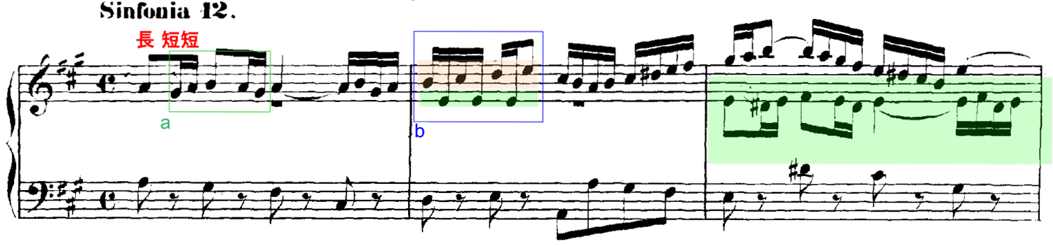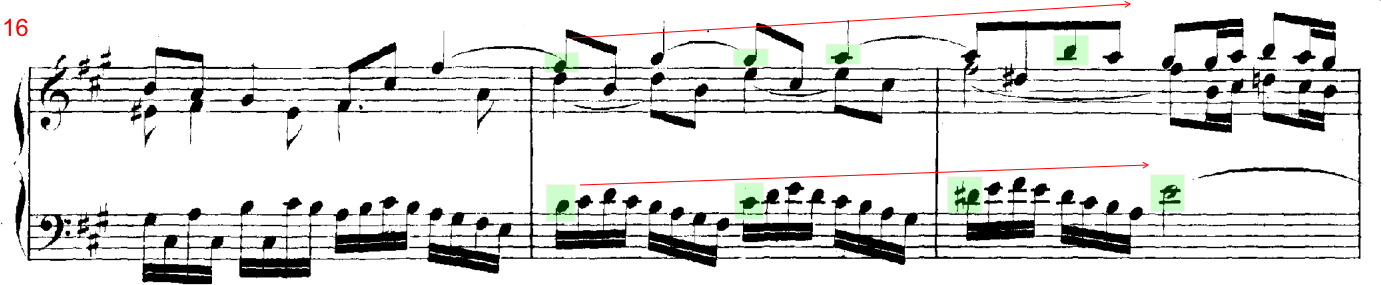 主題が上声部(主調)→中声部(属調)→下声部(主調)→上声部(属調)の順で提示され応答された後、トニックとドミナントの交替による調的対比は放棄されます。第9小節からは、それに代わって長短旋法による対比が打ち出されていきます。第9~14小節にかけて、上の譜例のaとbのモチーフがそれぞれ右手と左手に配置され、嬰ヘ短調の下行ゼクエンツを形作ります(左手の擬似的な2声部のうち、バスが順次下行のカタバシスを聴かせています)。冒頭の陽気さから一転して、深刻さが漂います。第13・14小節で、嬰ヘ短調の属音ペダルが1小節半にわたって響きますが、嬰ヘ短調の主和音に解決することなく、続けざまに主題が嬰ヘ短調に姿を変えて現れます。第17小節から再びゼクエンツが始まり、経過的にイ長調・ホ長調が響きますが、このとき、バスは今度はH→C(第17小節)→Dis→E(第18小節)へと、今度は上行し(アナバシス。最上声も順次上行します)、イ長調の明るさの中に、先ほどまでの深刻さが溶け込みます。
