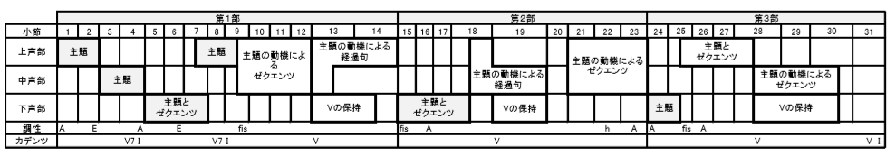 問題 第3小節から始まるテーマは何調ですか?また、主調との関係は【属調・下属調・平行調】です。 印がついている部分はどのような進行ですか? 【並行に動いている ・ 反行している】 第3小節~