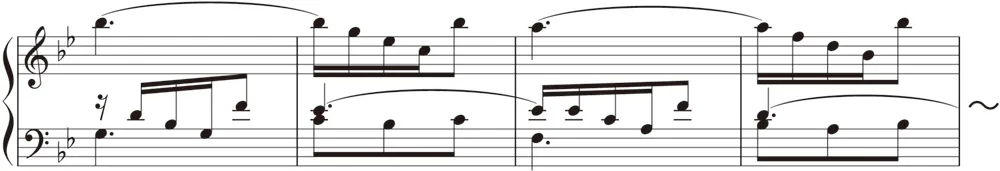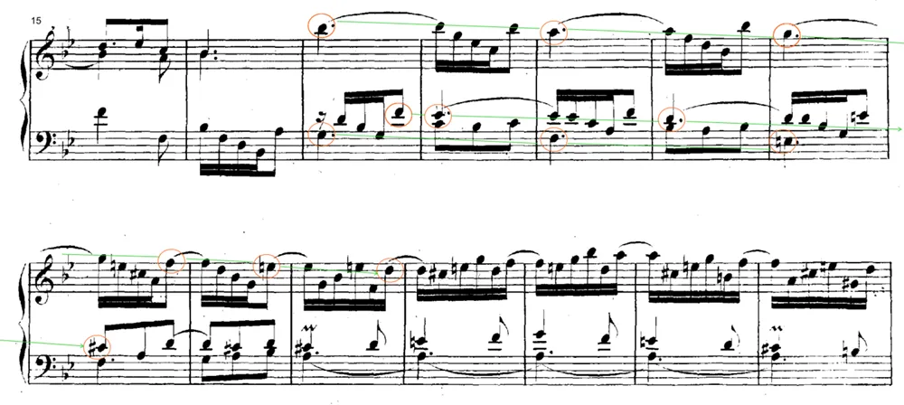 均整のとれた16小節(8小節+8小節)の第1部が変ロ長調で終わると、第17小節から主要モチーフが中声部と上声部に交互に配置されゼクエンツを形づくります。