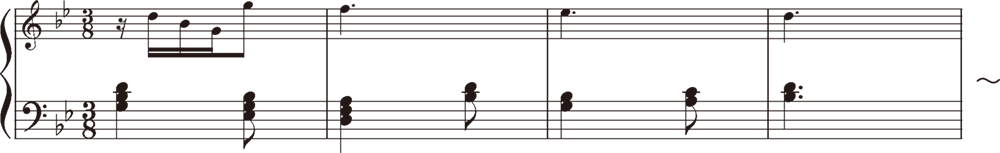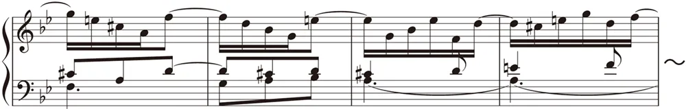 ニ短調で主題が回帰するかと思わせておいて、すぐさま冒頭の第3・4小節と同じ変ロ長調による繋留のパターンが現れ、すぐにまたニ短調に戻って再度、和声的に終止します。