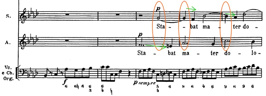 冒頭を見てみましょう。オレンジ色の◯で囲んだ上声部の音は、ニ度ずつ、長いため息のように中音域へと順次下行していきます。その間、中声部は上声部に対する繋留音を生じ、上声部とニ度でぶつかります。しかし、これはすぐに三度に解決して緊張と弛緩が交代していきます。