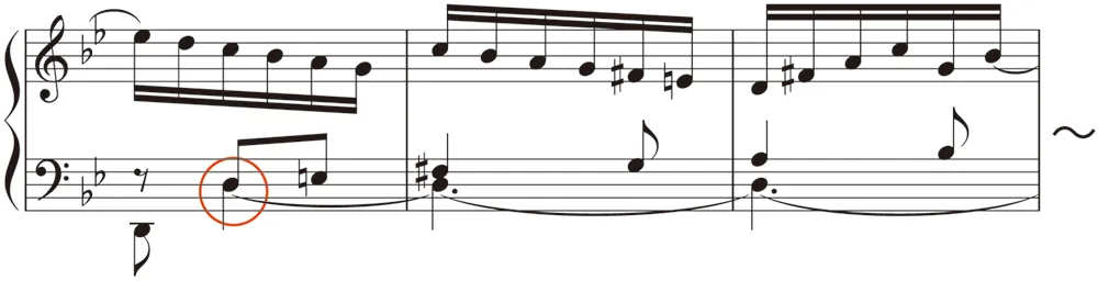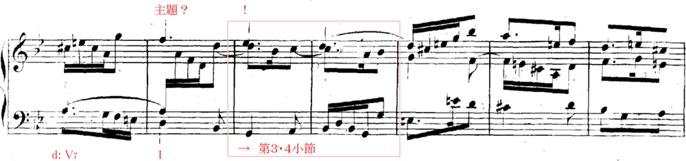 このゼクエンツでは、すべての声部が順次下行しています(上声部はBからDまで、中声部はFからCisまで、下声部はGからEまで)。ニ短調へと移り、第24小節からはV度のペダル音が次の区切りを予感させます。期待通り、和声はニ長調のIに落ち着き、冒頭主題の音型が現れますが、ここで一工夫が見られます。