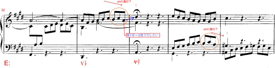 さて、第6番の修辞学的な醍醐味は第30小節以降に凝縮されています。第2部冒頭(第18小節)と同様、主題は低声部から次第に高音域へと移ります。しかし、第34小節で予期せぬ「事件」が起こります。突然の休止です。しかも、休止する際の和音は、根音を欠いた属7第3転回形というきわめて不安定な和音です(減3和音)。これだけでも「期待に反する」進行ですが、その印象をさらに強めているのが、旋律動向です。第33小節の第9拍にあるaは第7音なので、当然、gisへの解決が期待されます。ところが、再び7の和音がくるので、声部の配置転換が生じます。このとき、問題のaはdisに進行し、「音楽の悪魔」と呼ばれていた増4度が聞こえます(青い矢印)。そして、音楽は中断されます。聴き手の驚いた顔を想像して、バッハが悪戯っぽい笑みを浮かべているようです。再び主題(中声部)とその反行形(上声部)が始まりますが、中声部の主題はまたもやgisに解決できず、gへとはぐらかされてしまいます。