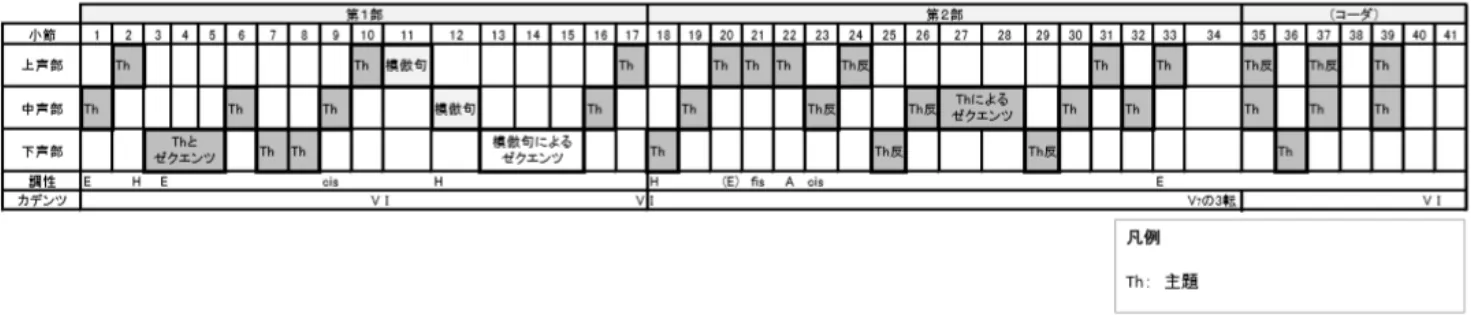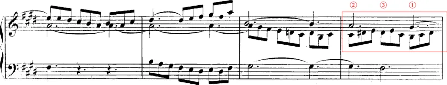 後半(第18小節~)は、主題が折り重なるように今度は低音域から高音域へと上り、第22小節で上声部が最高音aに達して主題を奏でる時、低声部も主題の反行形を聴かせます。主題とその反行形が天と地のように両極を形づくると、第22小節から第26小節にかけて主題の反行形が展開されます。第27~28小節小節には少し面白い操作が見られます。この部分では主題を構成する①、②、③の要素(譜例1)が、②、③、①(譜例2)のように置き換えられ、最小限の素材によって新たな展開が導かれていることがわかります。