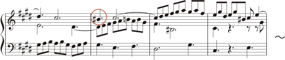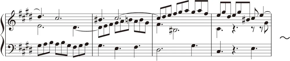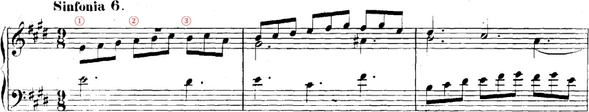 冒頭は、《シンフォニア》の典型的な方法により、主調による主題提示と属調による応答で幕を開けます。第10小節までは常に主題がいずれかの声部で聞こえ、他の2声部は繋留をうまく使って(第3~5小節、第7~8小節)、和声的な推進力を生み出しています(第1番の第3小節にも同様の繋留音の活用が見られます)。