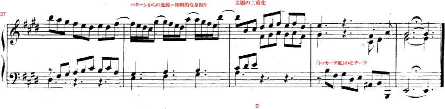 第38小節では、はじめて16分音符が現れ、それまでのリズムパターンを乱しながら、この曲の最高音(h)へと昇っていきます。hに到達すると、それまで反行形と組み合わされていた主題が、どちらも元の形で、6度で重ねられます。天と地の隔たりは解消され、主題は幸福な調和の中で手を取り合います。最後の2小節は、前半に出てきたトッカータ風の音型が不意に現れ、終止形へと導きます。