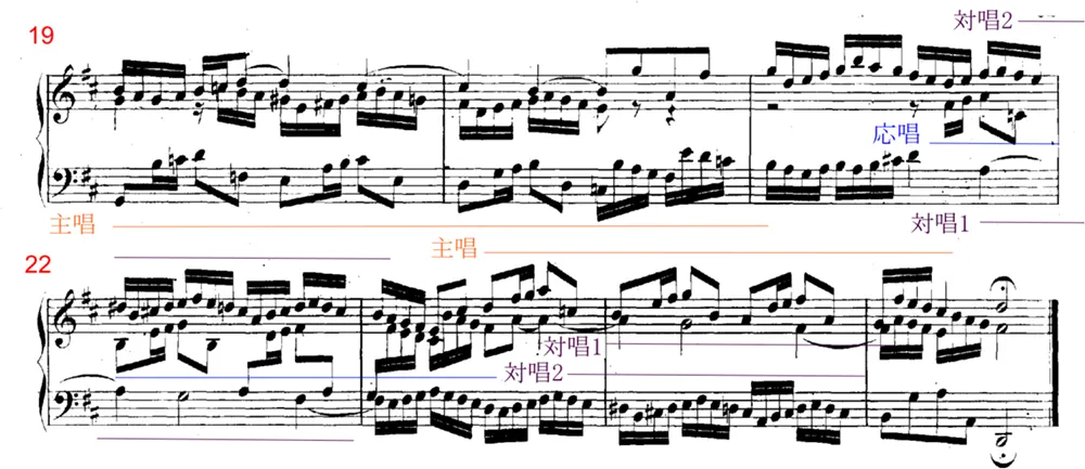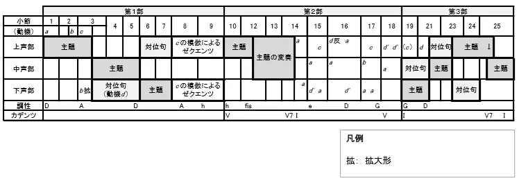 主題旋律の対称的な配置にも注目しましょう。第1部と第3部を比較すると、第1部では上声部(主唱)―中声部(応唱)―下声部(主唱)の順で各旋律が配置されています(譜例1)。これに対して、第3部では関係が逆に下声部(主唱)―中声部(応唱)―上声部(主唱)となっていることが分かります(譜例2)。主題旋律が上声部から下声部に下がって再び上声部に戻る、というお椀型の主題配置は、主題それ自体の旋律線にも似ています。譜例1のaからbにかけて音域がa音からg音まで長9度下行し、そこから長10度上(h音)まで昇ります。